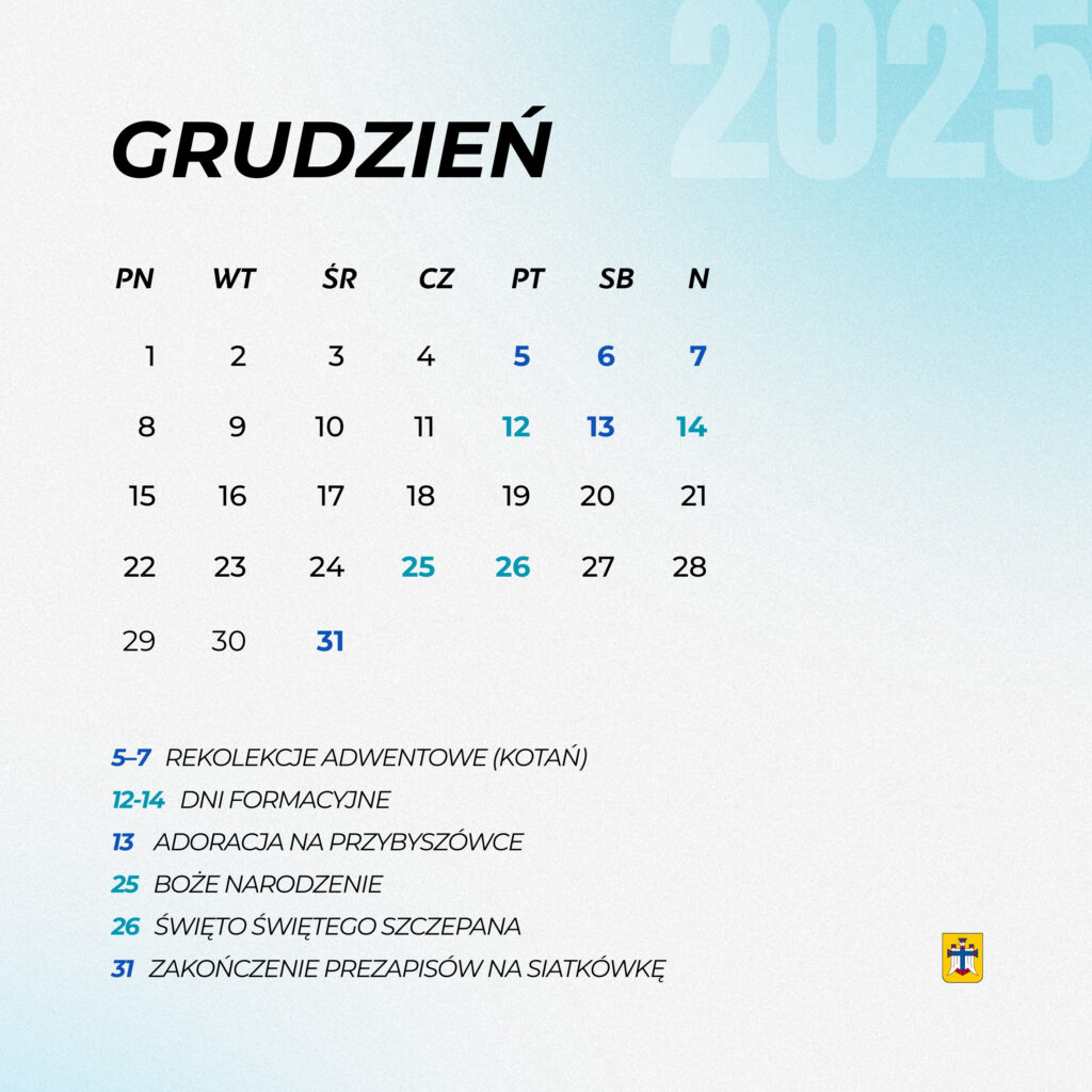 Przed nami wiele pięknych wydarzeń, które pomogą nam dobrze przeżyć ten czas: 5–7 grudnia odbędą się rekolekcje adwentowe w Kotanii — chwile modlitwy, ciszy i refleksji. 12–14 grudnia spotkamy się na dniach formacyjnych, by wspólnie wzrastać w wierze i jedności wspólnoty. 25 grudnia przeżyjemy Boże Narodzenie — dzień radości z narodzin Zbawiciela. ❤️ 26 grudnia uczcimy święto św. Szczepana, pierwszego męczennika. 31 grudnia zapisy na turniej siatkówki trwają tylko do końca roku! Zachęcamy do aktywności i wspólnej zabawy